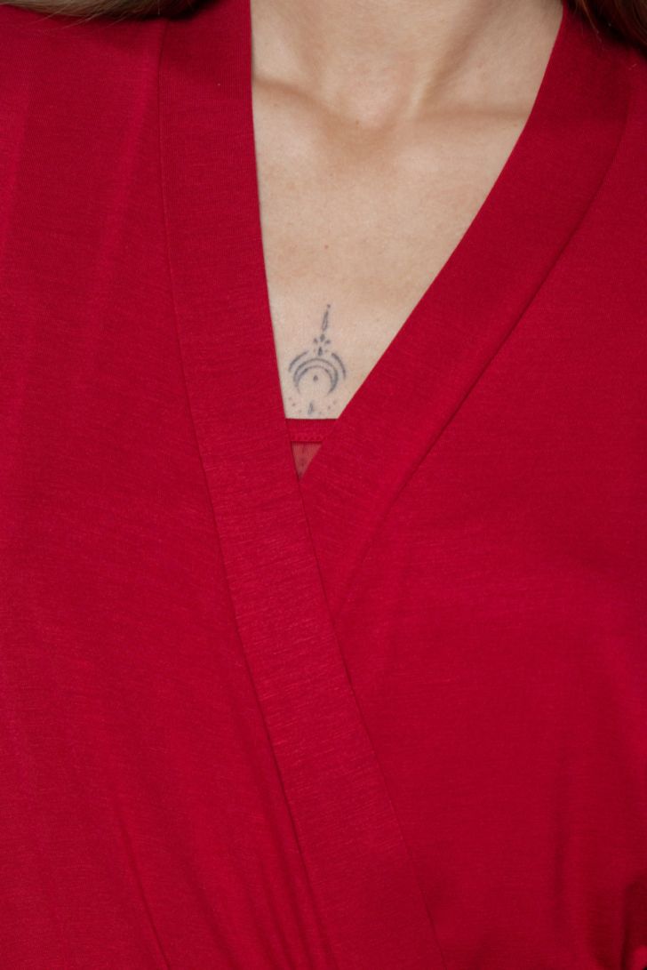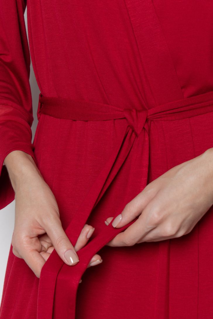 Пеньюар с запахом в длине миди. Длинный пояс фиксирует силуэт и подчёркивает талию. Широкие рукава декорированы вставками из полупрозрачной сетки. Практичные боковые карманы делают пеньюар не только красивым, но и функциональным элементом домашнего гардероба.