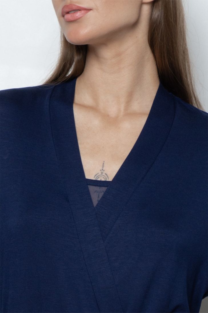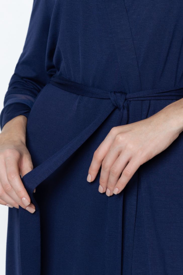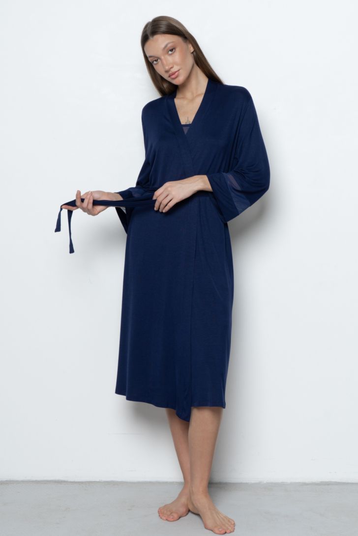 Пеньюар с запахом в длине миди. Длинный пояс фиксирует силуэт и подчёркивает талию. Широкие рукава декорированы вставками из полупрозрачной сетки. Практичные боковые карманы делают пеньюар не только красивым, но и функциональным элементом домашнего гардероба.