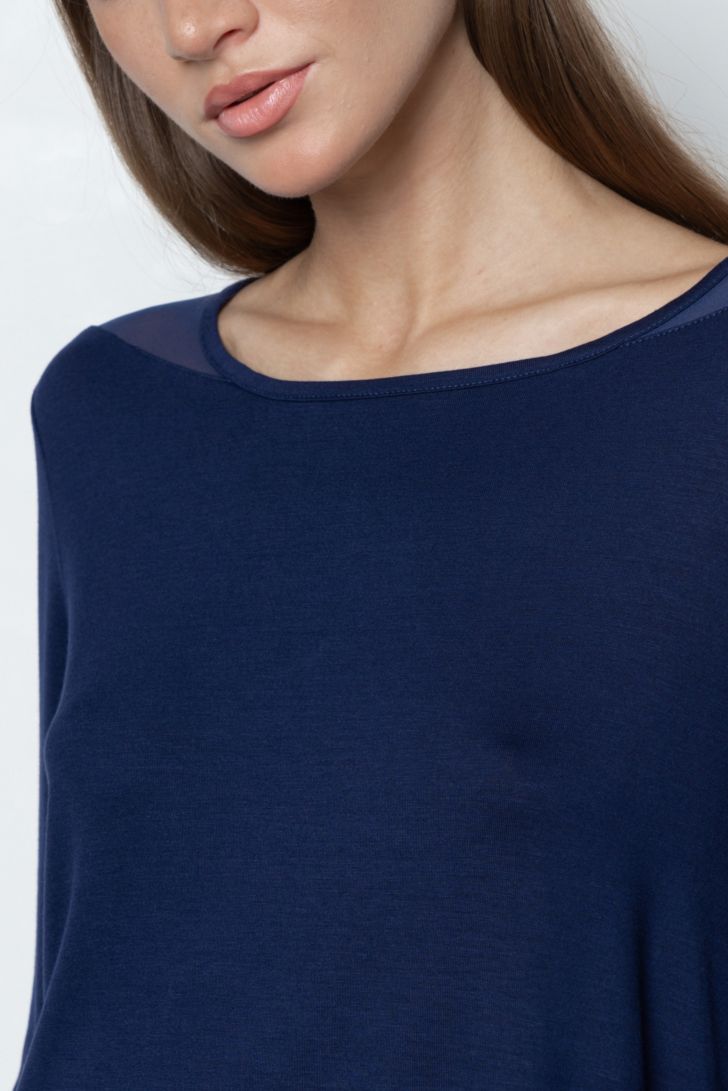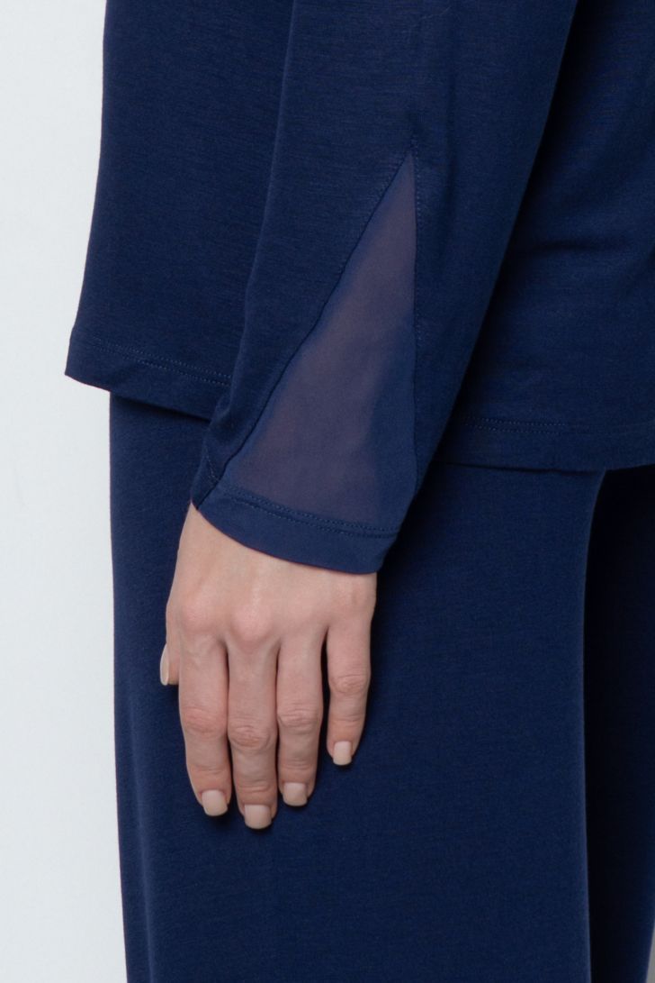 Струящаяся пижама состоит из лонгслива и свободных брюк. Лонгслив прямого силуэта с круглым вырезом горловины. Линия плеча слегка приспущена для большего комфорта и дополнена вставками из полупрозрачной сетки. Прозрачные вставки в форме вытянутого треугольника так же расположены на рукавах, создавая лёгкий и изящный акцент. Брюки прямого силуэта на комфортном поясе с мягкой резинкой.