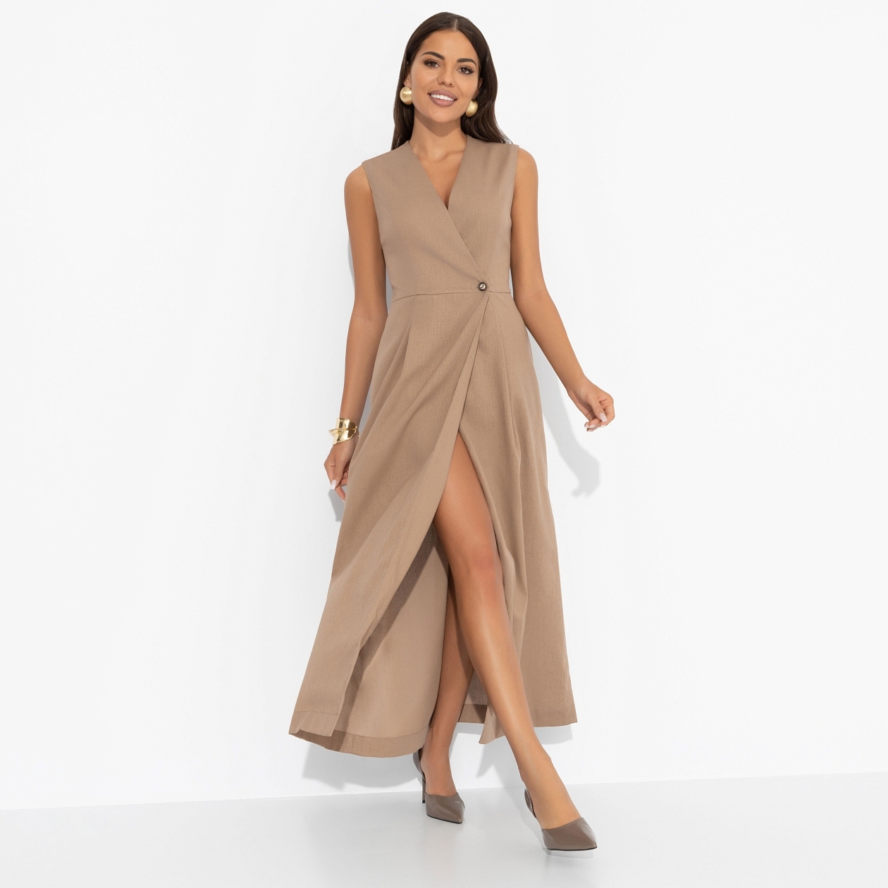 В зале становится тише. Платье, которое отменяет конкуренцию и включает поклонение. Ты не ищешь внимания, ты – его первоисточник.Платье в длине макси. Есть карманы. Приталенный силуэт изделия. Застегивается на пуговицу. За счет нахлеста есть глубокий разрез по юбке.