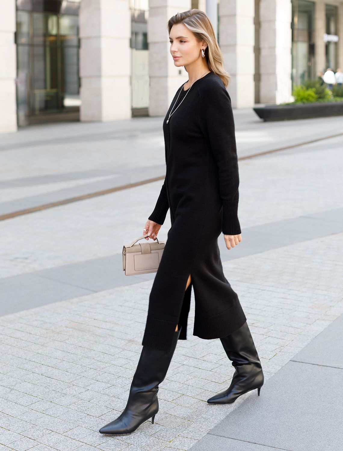 Платье длины миди выполнено из мягкой меланжевой пряжи с кашемиром. Модель прямого силуэта дополнена двумя высокими боковыми разрезами. Вязаный кант вертикально проходящий по всему изделию, визуально стройнит и вытягивает силуэт. При желании можно подчеркнуть линию талии, используя контрастный пояс.