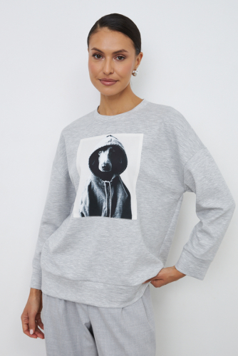 Джемпер из эластичного полотна свободного силуэта. Втачной длинный рукав в спущенную пройму. Круглый вырез горловины оформлен бейкой. По низу изделия и рукавов выполнены притачной пояс и манжеты из основной ткани. На передней и задней части изделия выполнена аппликация. В таблице размеров представлены параметры человека, а не изделия.