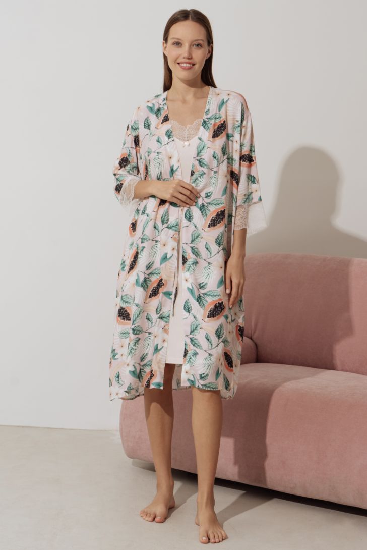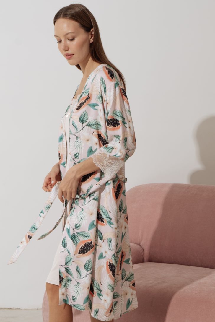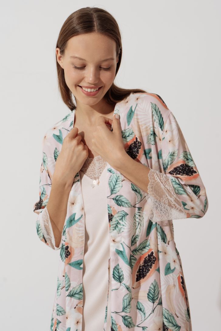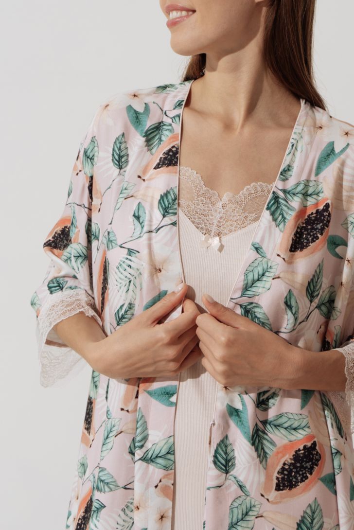 Пеньюар элегантной длины на запахе с рукавом ¾ . Рукав декорирован кружевными вставками. Линия плеча приспущена. В боковых швах разрезы