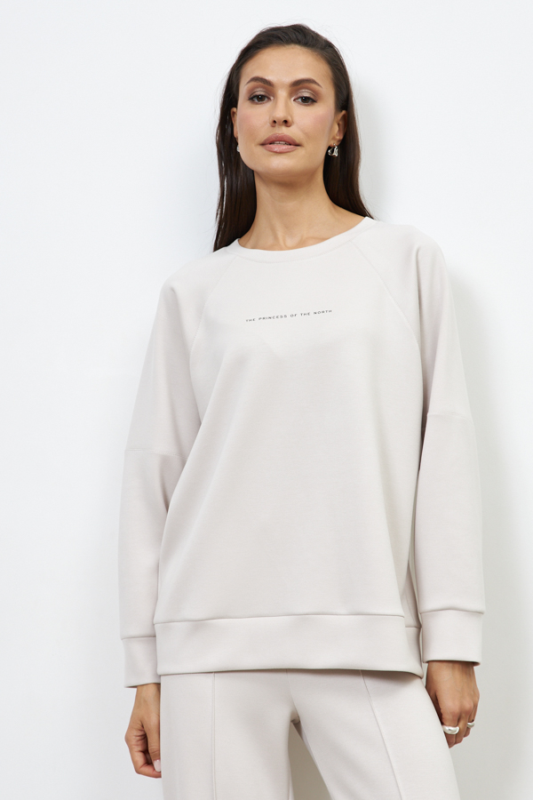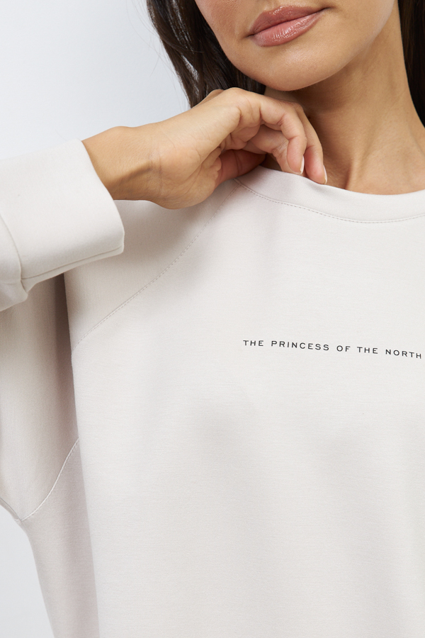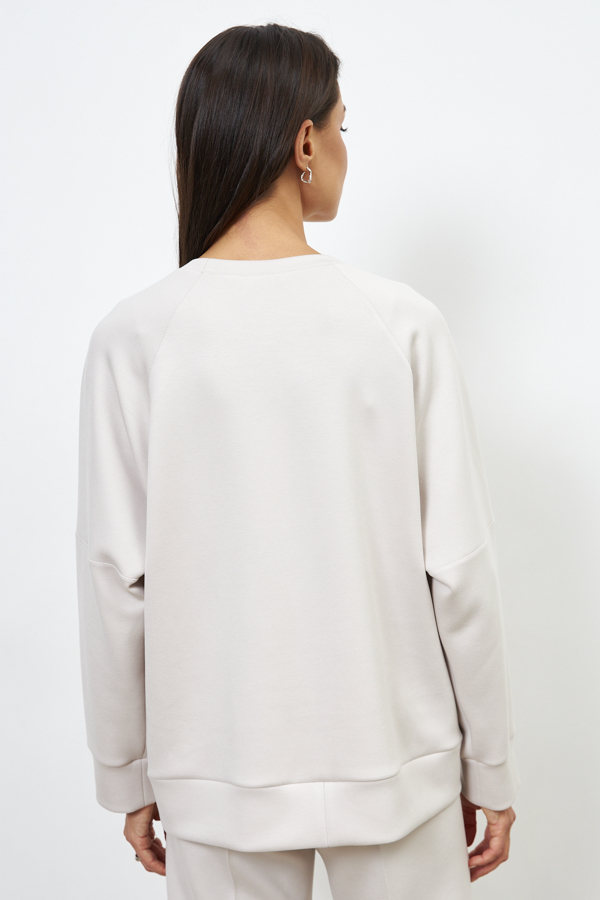 Свитшот из эластичного полотна свободного силуэта. Круглый вырез горловины оформлен бейкой. Рукав реглан с горизонтальным швом в области локтевого сгиба. По низу изделия и рукавов выполнены притачной пояс и манжеты из основной ткани. В таблице размеров представлены параметры человека, а не изделия.