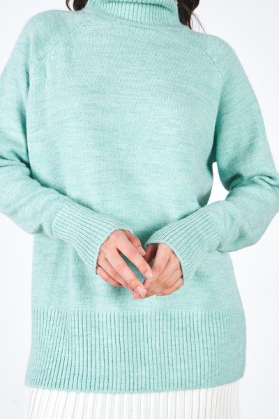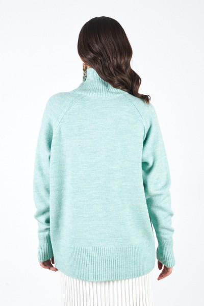 Джемпер свободного силуэта. Длинный рукав-реглан. Низ изделия и низ рукава оформлены резинкой, воротник-стойка. Изделие выполнено из мягкой меланжевой пряжи.