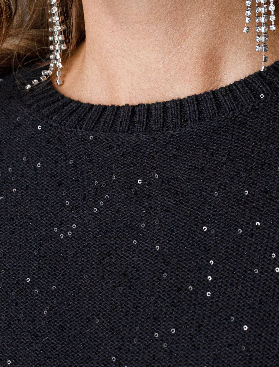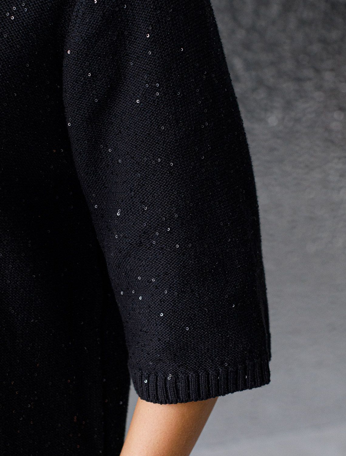 Эффектное платье черного цвета с широкими рукавами средней длины выполнено из хлопковой пряжи с вкраплением сияющих пайеток, что придает особую изысканность. Платье связано изнанкой, пряжа отличается легкостью и приятной текстурой, совершенно не колется, обеспечивает комфорт даже при длительном использовании, а натуральные волокна поддерживают оптимальный температурный баланс. Крой полуприлегающий, подчеркивает женственный силуэт, а круглый ворот, манжеты на рукавах и по низу гармонично завершают дизайн, создающий аккуратный образ. Благодаря универсальному крою, платье подойдет девушкам и женщинам пышных форм и больших размеров, длина миди подходит на низкий и высокий рост. Мерцающее полотно добавляет особого шарма вашему образу, делая его уместным как на праздник, так и для повседневного выхода. Новый год, вечеринка или любое другое мероприятие пройдут ярко — сияющие пайетки создают ощущение праздника в каждом движении. Это стильное платье поможет чувствовать себя уверенно на любом мероприятии в осенний и зимний сезон.