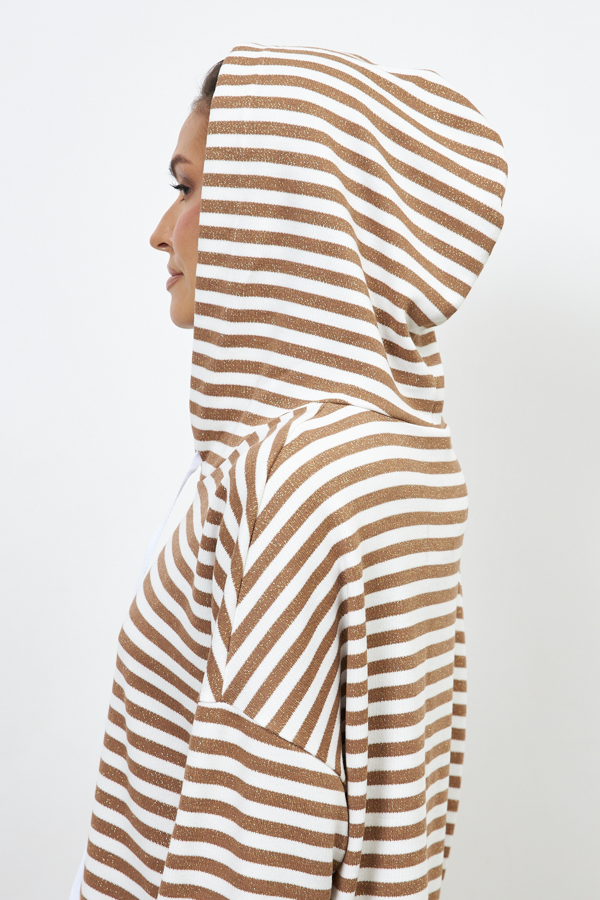 Худи с капюшоном из эластичного полотна. Изделие свободного силуэта со спущенной линией плеча и длинным рукавом. В таблице размеров представлены параметры человека, а не изделия.