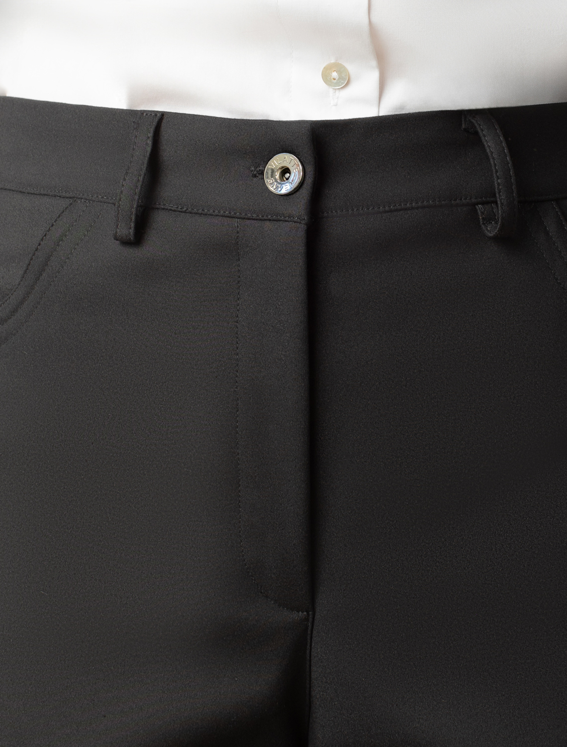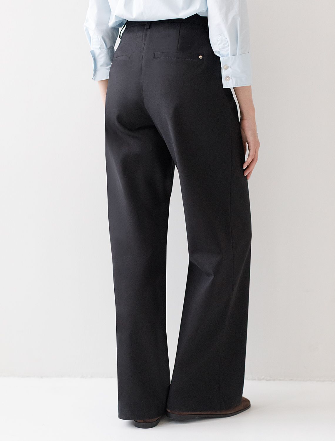 Брюки-трубы выполнены из плотной хлопковой эластичной ткани с добавлением нейлона. Любимая классика делового стиля, которая должна быть в любом гардеробе, так как такая вещь практична и многофункциональна. Для особого случая на важной встрече в паре с блузкой или для офисного дресс-кода с топом и жакетом. В повседневной жизни с более неформальным верхом и обувью на высоком или низком каблуке.