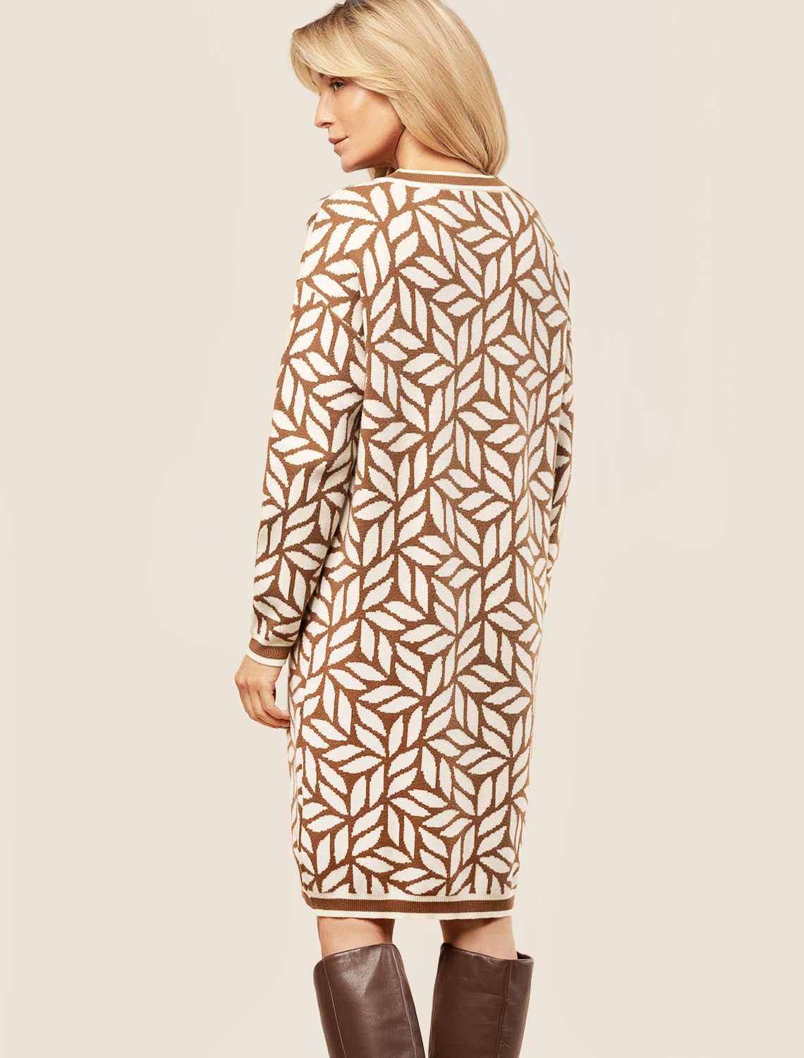Платье жаккардовой вязки выполнено из мягкой пряжи на основе вискозы с добавлением кашемира. Модель свободного силуэта подходит для любой фигуры. Нежная пряжа очень комфортно ощущается на теле, сохраняя оптимальное тепло при этом не перегревая. Совет стилиста: жаккардовое платье отличная инвестиция в базовый гардероб, которая поможет создать дорогие образы. Носите с высокими сапогами удлиняя силуэт или плотными колготками.
