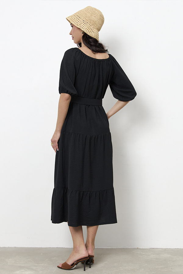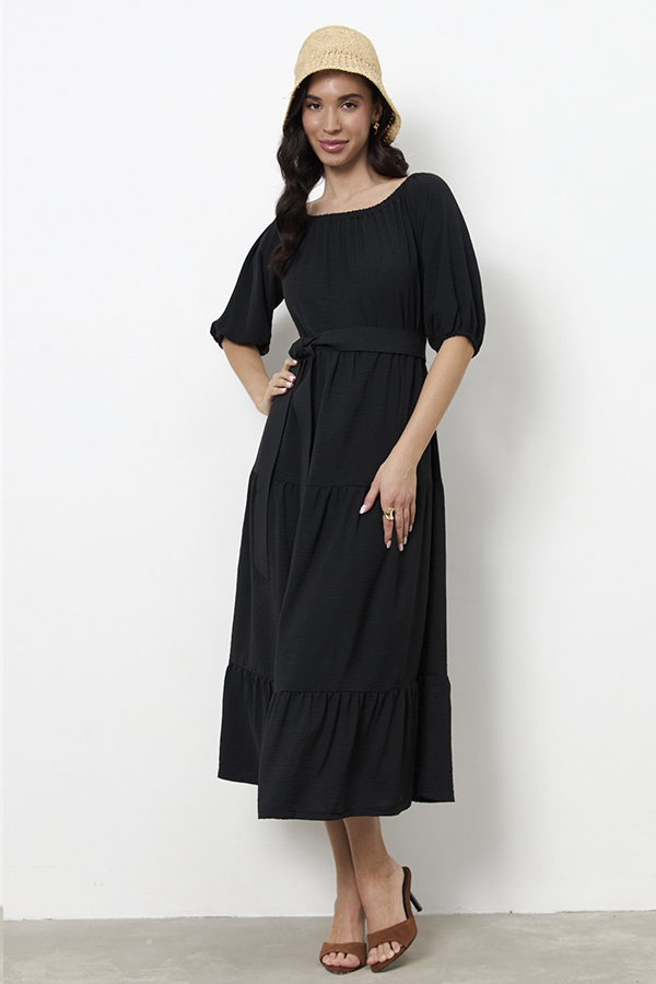 Платье свободного силуэта из ткани с крэш-эффектом, отрезное по линии талии. Нижняя части платья с воланами. Рукав-реглан до локтя. По низу рукава сборка на резину. Линия плеча и линия горловина оформлены сборкой на резину. В комплекте пояс из основной ткани.