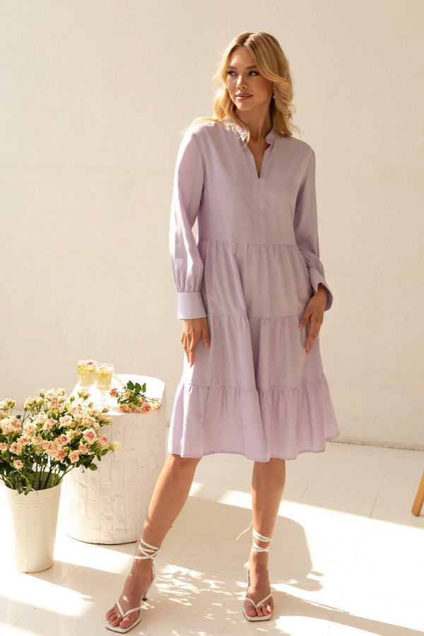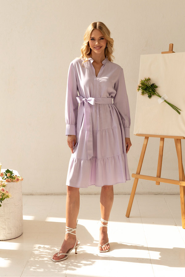Платье свободного силуэта из вискозной плательной ткани. Изделие отрезное по линии талии, с ярусами на юбке. V-образный вырез горловины обработан воротником-стойкой. Втачной рукав на манжете с застёжкой на пуговицы. В комплекте пояс из основной ткани. В таблице размеров представлены параметры человека, а не изделия.