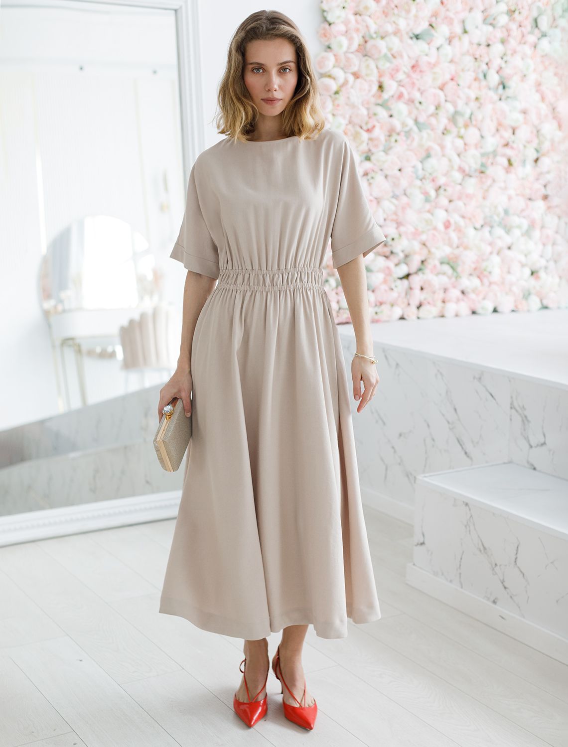 Ст.цена 3490р Платье из плотного лиоцелла с поясом на резинке D22.244 светло-бежевый