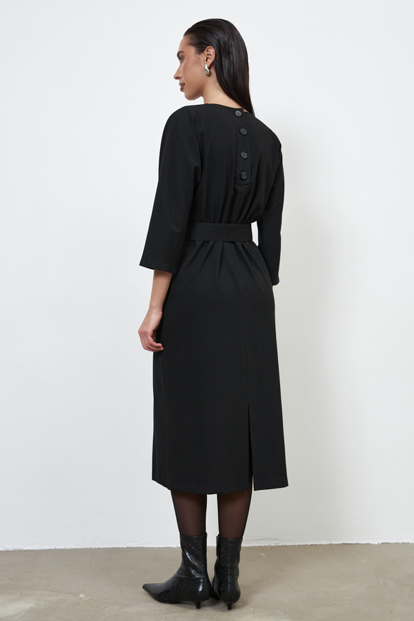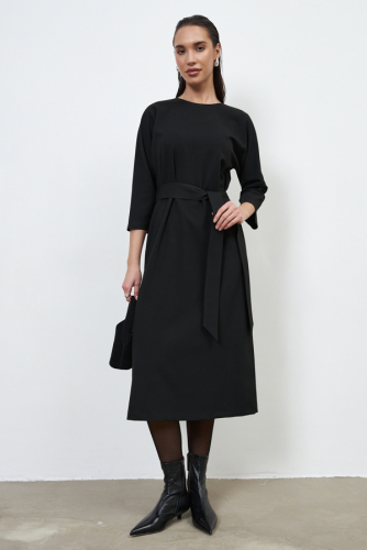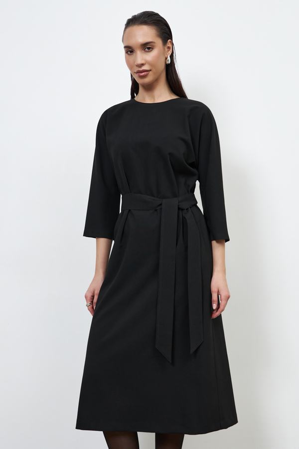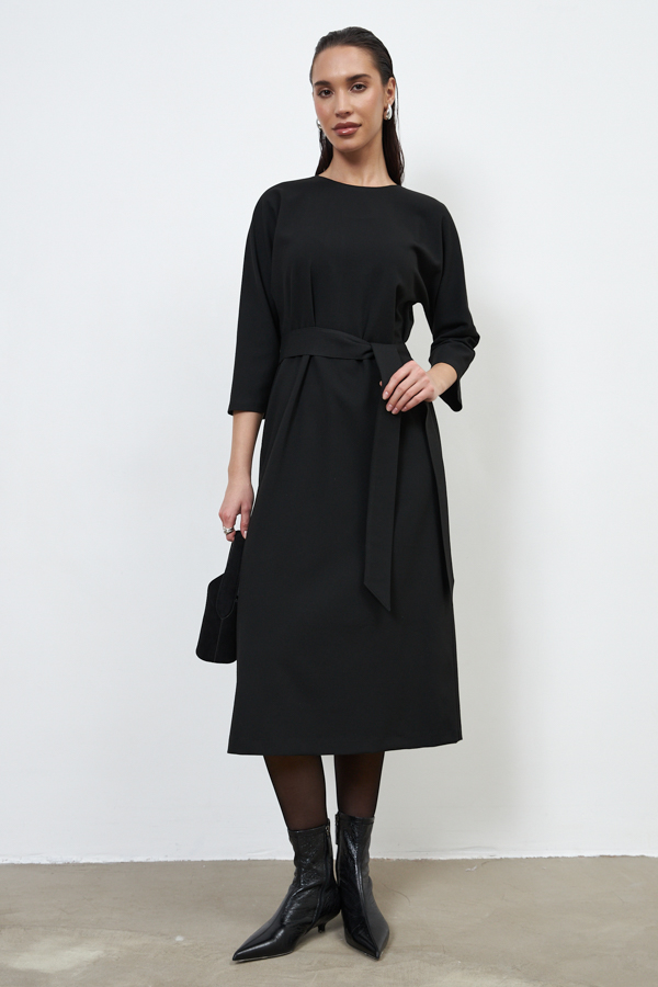 Платье из плательной ткани. Свободный силуэт, слегка прилегающий в области бедра. По спинке изделия выполнена застёжка на декоративные пуговицы, снизу-разрез. Цельнокроеный рукав 3/4. Круглый вырез горловины. В комплекте пояс, позволяющий создавать приталенный силуэт.