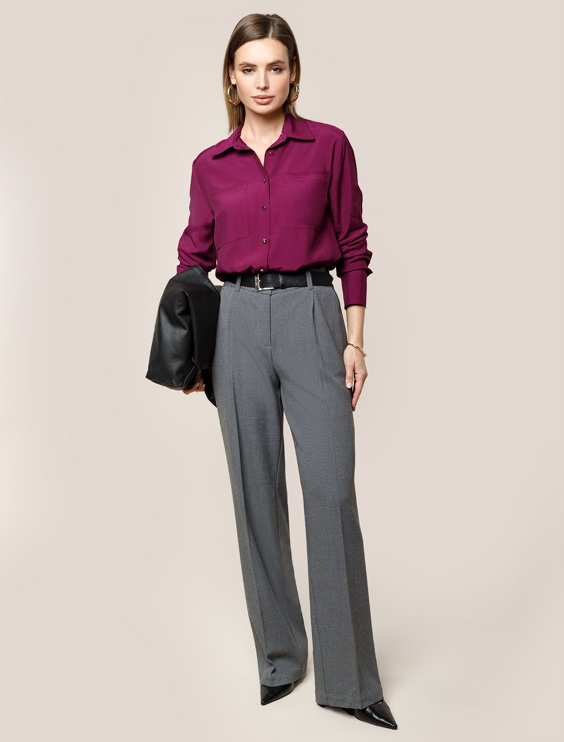 Брюки-палаццо выполнены из фактурной черно-серой поливискозы. . Модель дополнена боковыми карманами и отлично подойдет как для строгого делового образа с блузкой и жакетом, так и для более расслабленного с футболкой и водолазкой. Эластичный материал изделия поддерживает оптимальный микроклимат, формоустойчивость и комфорт в течение всего дня.