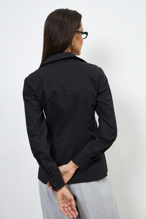 Рубашка из хлопковой ткани прилегающего силуэта с застёжкой на пуговицы. Оригинальный крой с завязками на передней части изделия. На задней части выполнены вытачки. Рубашечный рукав на манжете с застёжкой на пуговицы. Вырез горловины обработан отложным воротником на стойке.