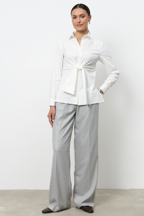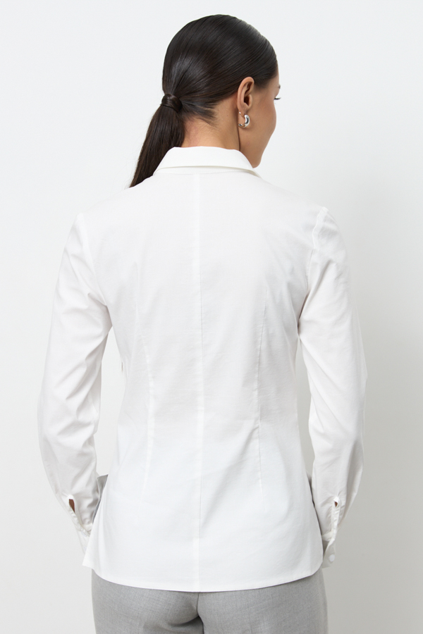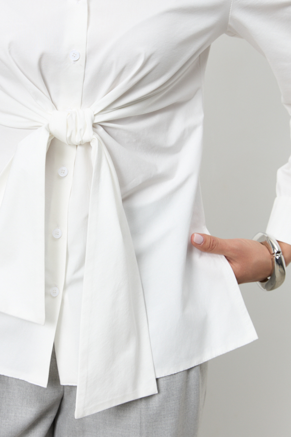 Рубашка из хлопковой ткани прилегающего силуэта с застёжкой на пуговицы. Оригинальный крой с завязками на передней части изделия. На задней части выполнены вытачки. Рубашечный рукав на манжете с застёжкой на пуговицы. Вырез горловины обработан отложным воротником на стойке.