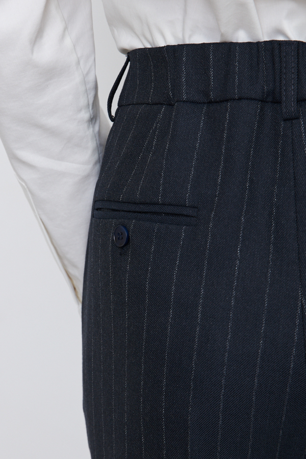 Брюки из костюмной ткани прямого силуэта. Застёжка на молнию-гульфик и пуговицу. В боковых швах выполнены карманы с подкройным бочком. Притачной пояс со шлёвками. На задней половинке брюк карманы в рамку с пуговицей, на поясе вставка с резиной.