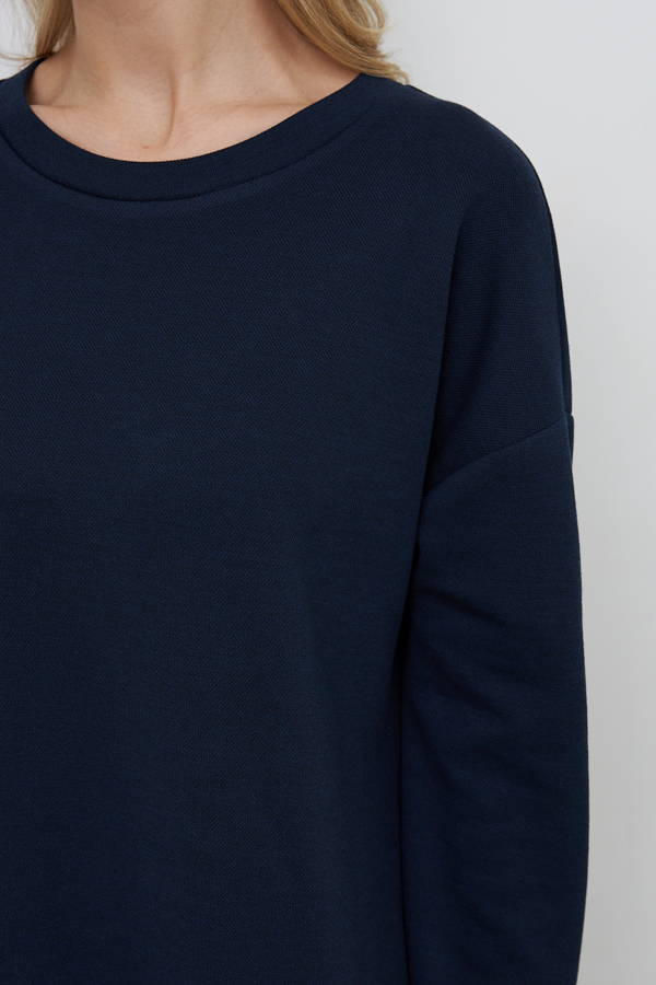 Платье из эластичного полотна свободного силуэта с разрезом в боковом шве. Изделие со спущенной линией плеча и длинным рукавом. Вырез горловины оформлен бейкой из основной ткани. В таблице размеров представлены параметры человека, а не изделия.