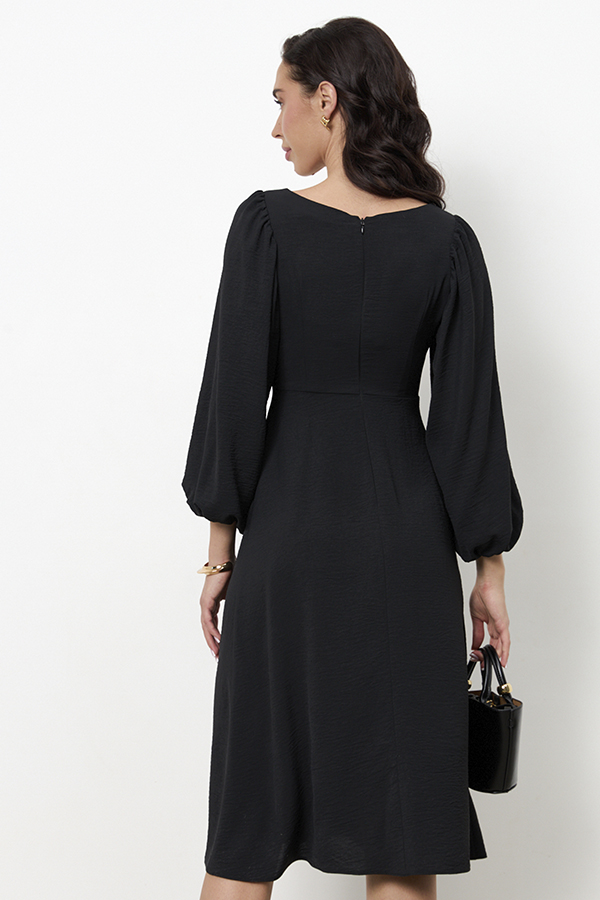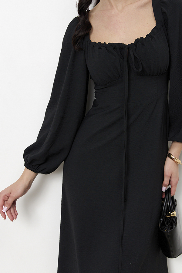 Платье приталенного силуэта, расширенное книзу из ткани с крэш-эффектом. Отрезное по линии талии. Верхняя часть с отрезным лифом, подрез фигурный. По верхнему краю лифа кулиска, в которую вставлены бретели-завязки, формирующие драпировку. Вырез горловины глубокий, расширенный, по форме напоминающий каре, с вырезом до линии подреза. Прилегание платья создано за счет рельефов на деталях переда и вытачек на деталях верхней и нижней части спинки. В верхней части среднего шва спинки застежка на потайную молнию. Рукава втачные, длинные, со сборкой по окату и низу рукава. В подгибку низа рукава вставлена резинка.