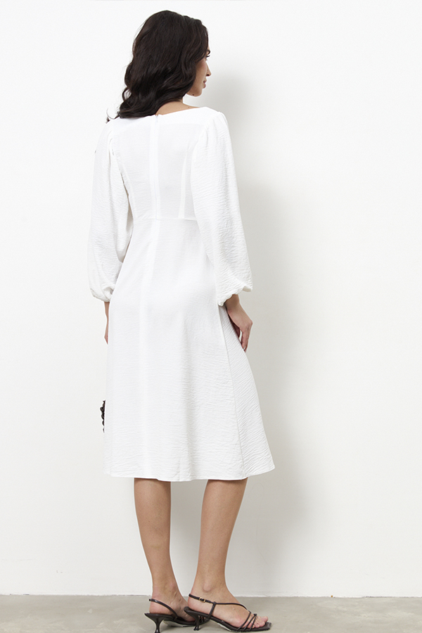 Платье приталенного силуэта, расширенное книзу из ткани с крэш-эффектом. Отрезное по линии талии. Верхняя часть с отрезным лифом, подрез фигурный. По верхнему краю лифа кулиска, в которую вставлены бретели-завязки, формирующие драпировку. Вырез горловины глубокий, расширенный, по форме напоминающий каре, с вырезом до линии подреза. Прилегание платья создано за счет рельефов на деталях переда и вытачек на деталях верхней и нижней части спинки. В верхней части среднего шва спинки застежка на потайную молнию. Рукава втачные, длинные, со сборкой по окату и низу рукава. В подгибку низа рукава вставлена резинка.