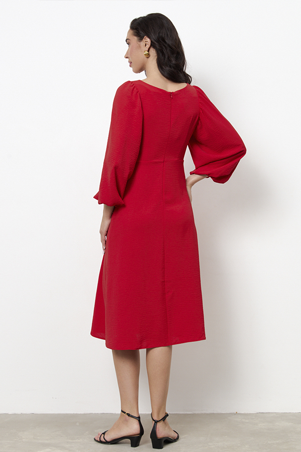 Платье приталенного силуэта, расширенное книзу из ткани с крэш-эффектом. Отрезное по линии талии. Верхняя часть с отрезным лифом, подрез фигурный. По верхнему краю лифа кулиска, в которую вставлены бретели-завязки, формирующие драпировку. Вырез горловины глубокий, расширенный, по форме напоминающий каре, с вырезом до линии подреза. Прилегание платья создано за счет рельефов на деталях переда и вытачек на деталях верхней и нижней части спинки. В верхней части среднего шва спинки застежка на потайную молнию. Рукава втачные, длинные, со сборкой по окату и низу рукава. В подгибку низа рукава вставлена резинка.