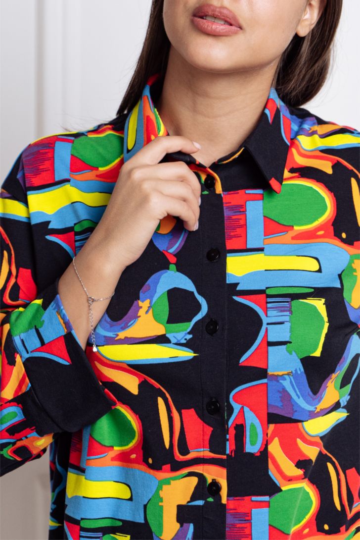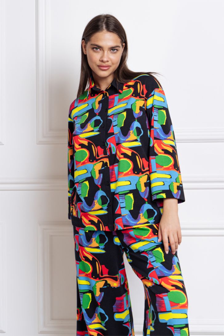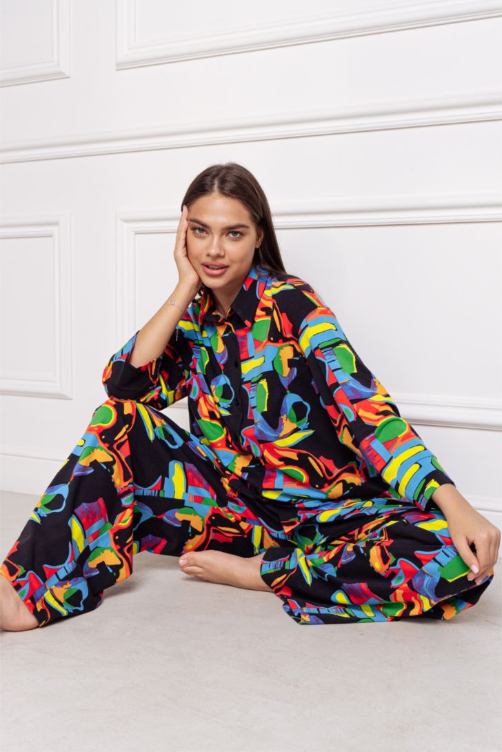 Комплект состоит из укороченной рубашки и прямых брюк свободного силуэта на резинке с карманами. Рукав рубашки декорирован манжетой.