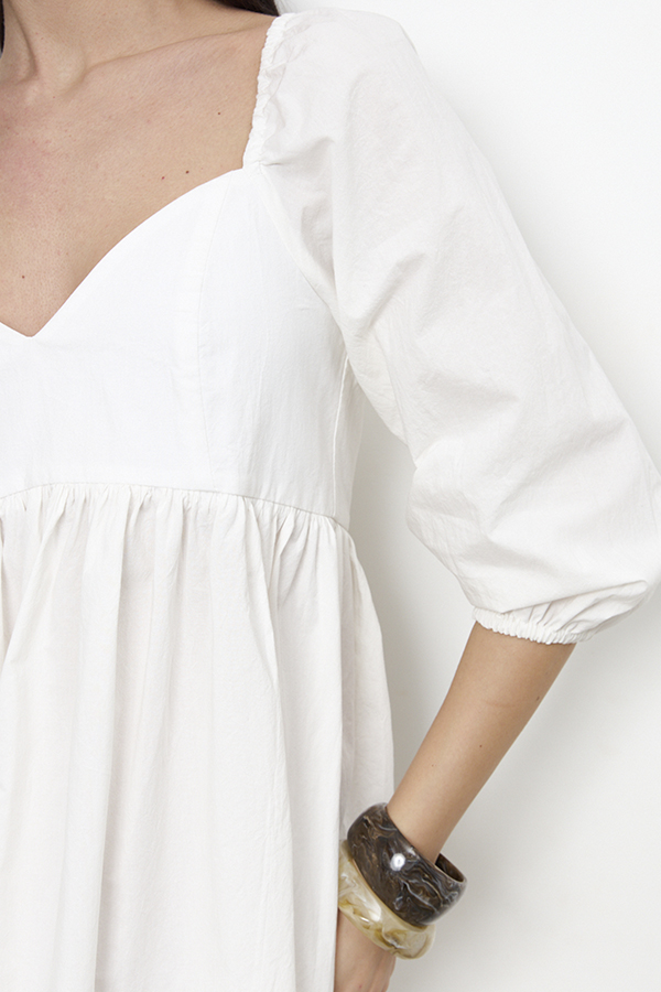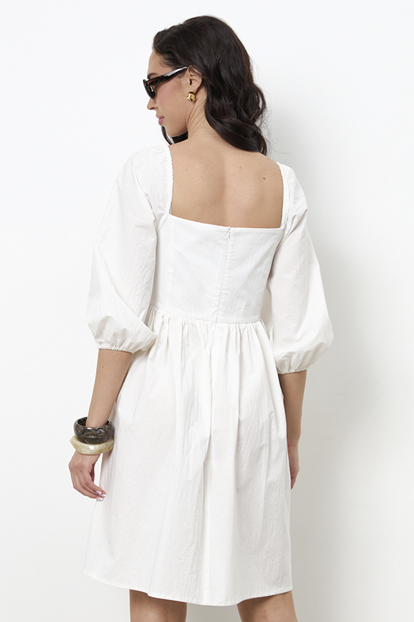 Платье свободного силуэта из хлопковой ткани. Изделие отрезное по линии талии. Линия талия завышена и фигурная. Верхняя часть юбки со сборкой. По среднему шву спинки потайная молния. Лиф переда и спинки двухслойный, имеет рельефные швы. Окат рукава и низ рукава зафиксированы резиной.