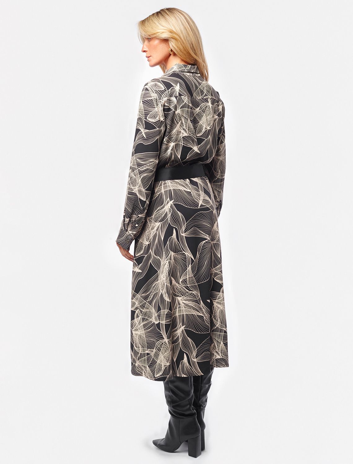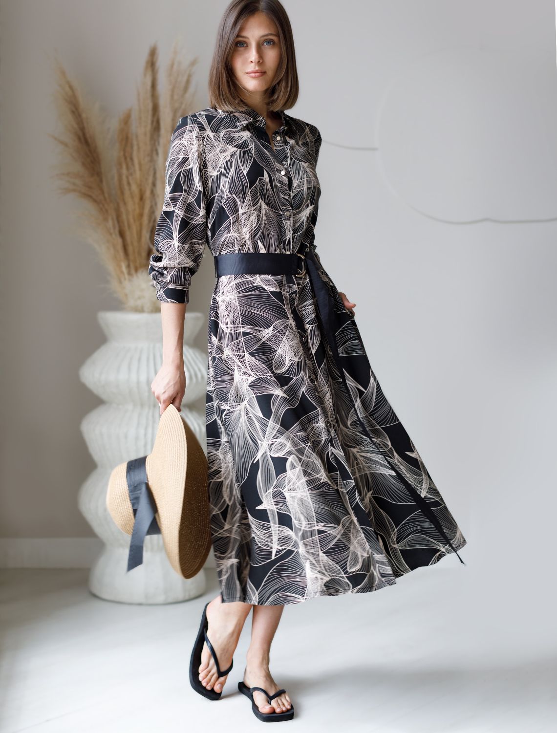 Платье А-силуэта с отложным воротником как у рубашки выполнено из премиальной вискозы. Модель с графичным растительным принтом дополнена удобными боковыми карманами и поясом из репсовой ленты. Застежка на золотистые пуговицы во всю длину изделия позволяем создать спереди нужный разрез. Материал – очень приятен к телу именно в осеннее время за счет его особенного плетения создает уютный обволакивающий эффект и в тоже время не теряет своей легкости.