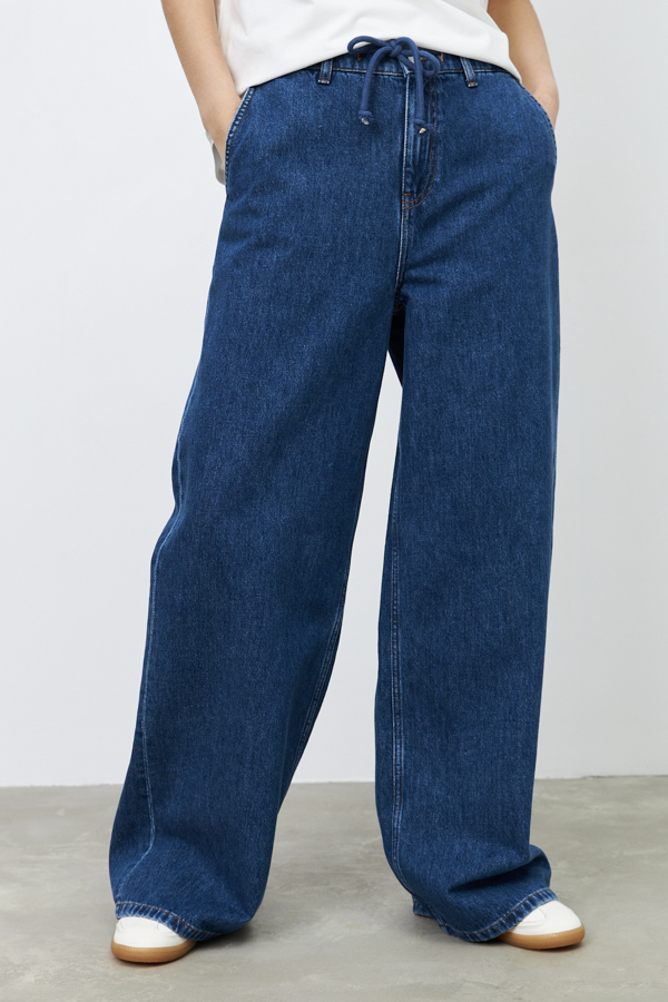 Брюки из денима выполнены по классической джинсовой технологии (варка с эффектом легкого выбеливания). Прямой широкий крой. На задней части брюк выполнены накладные карманы, на передней - карманы с подкройным бочком. Притачной пояс со шлёвками и кулиской. Застёжка на молнию-гульфик и пуговицу.