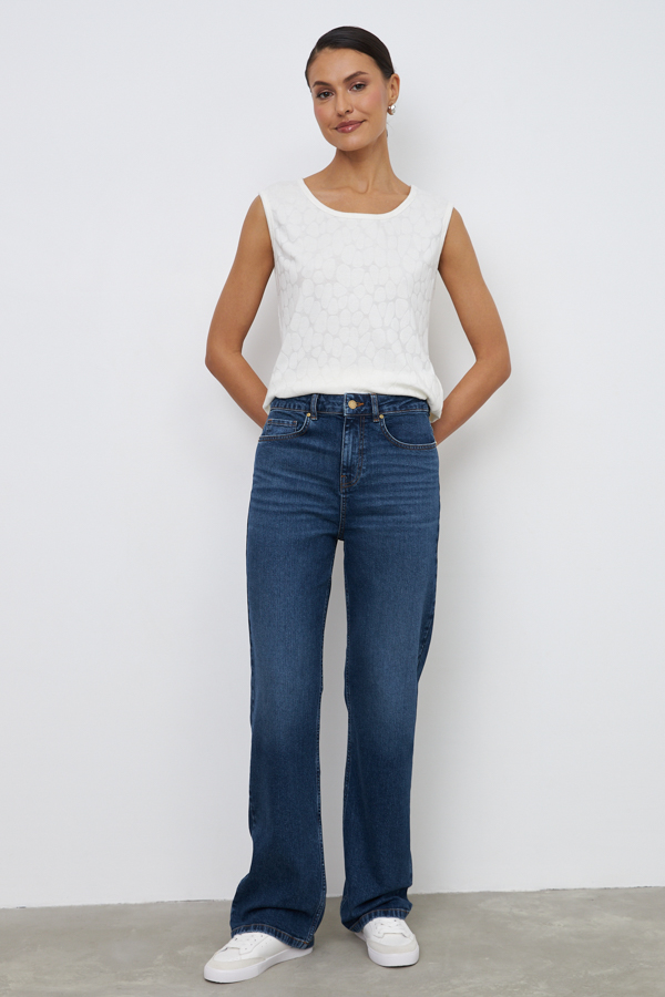 Брюки из эластичного денима выполнены по классической джинсовой технологии (варка с эффектом легкого выбеливания). Прямой классический крой. На задней части брюк выполнены накладные карманы, на передней - карманы с подкройным бочком. Притачной пояс со шлёвками. Застёжка на молнию-гульфик и пуговицу.