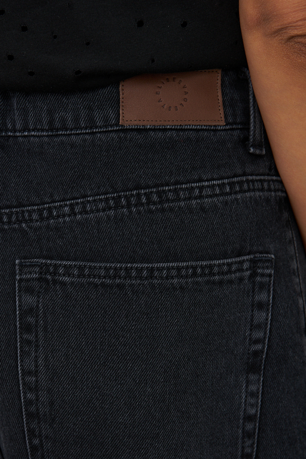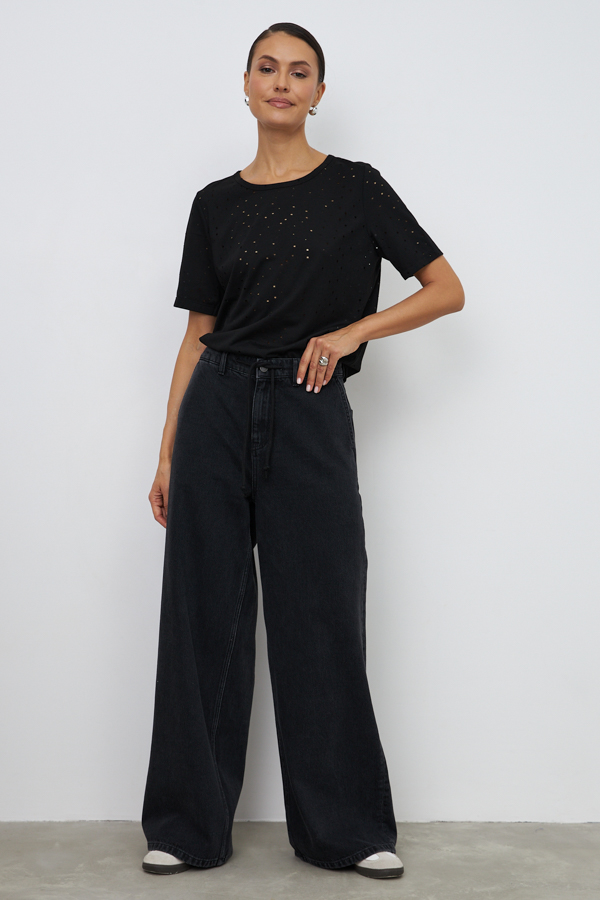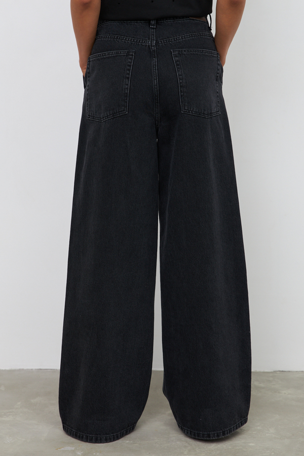 Брюки из денима выполнены по классической джинсовой технологии (варка с эффектом легкого выбеливания). Прямой широкий крой. На задней части брюк выполнены накладные карманы, на передней - карманы с подкройным бочком. Притачной пояс со шлёвками и кулиской. Застёжка на молнию-гульфик и пуговицу.