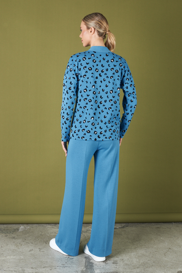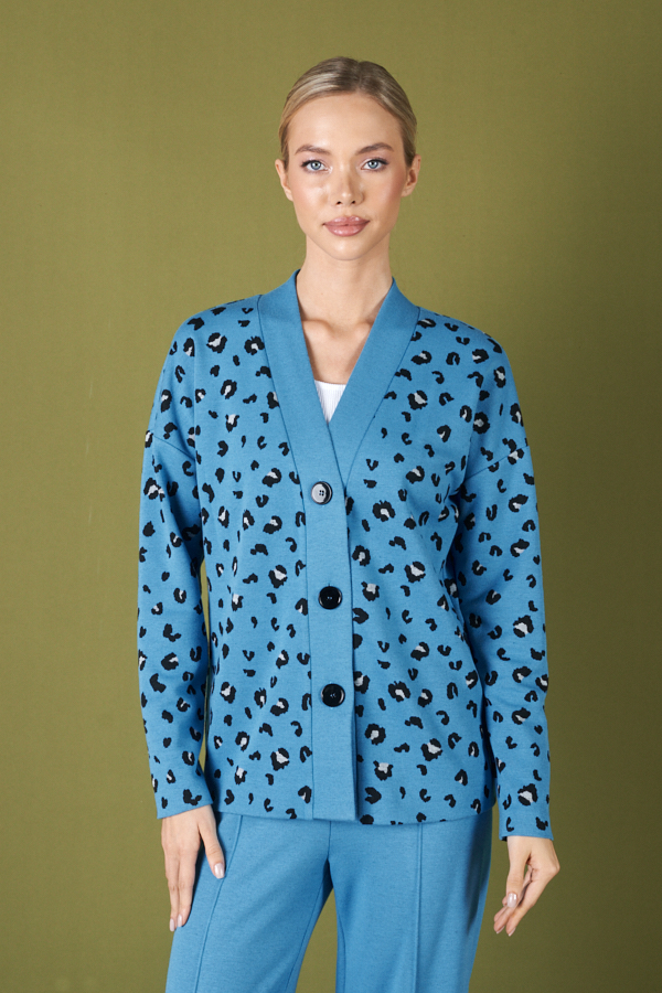Костюм из брюк и кардигана. Брюки прямого силуэта из эластичного полотна. На передней части брюк застрочены стрелки. Пояс притачной с эластичной резиной. Кардиган из эластичного полотна с жаккардовым узором. Свободный силуэт с контрастной притачной планкой и застёжкой на пуговицы. Втачной длинный рукав в спущенную пройму.