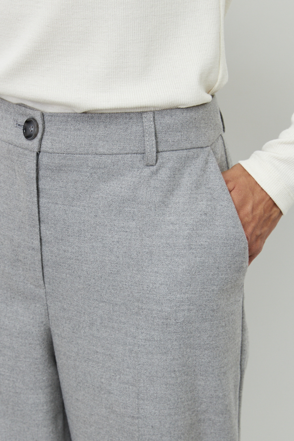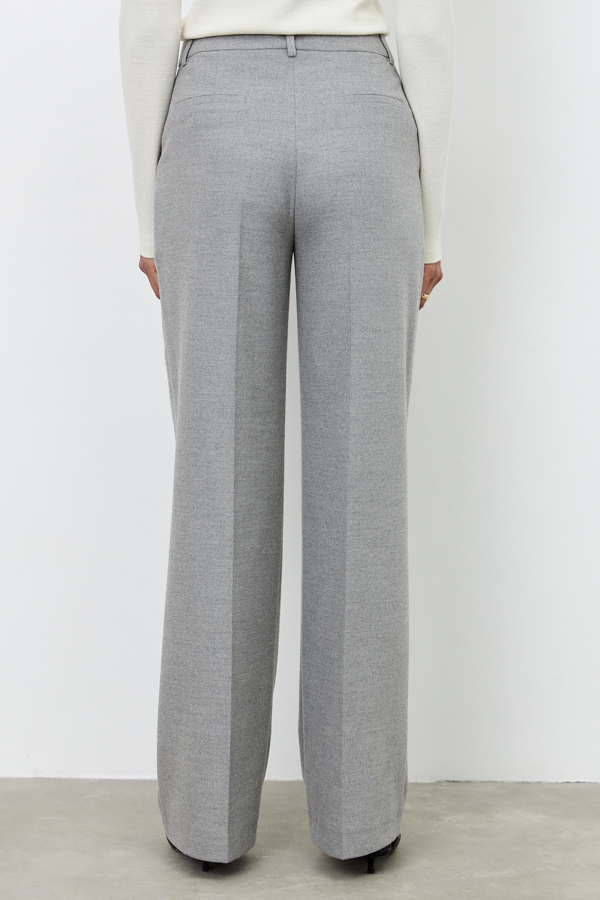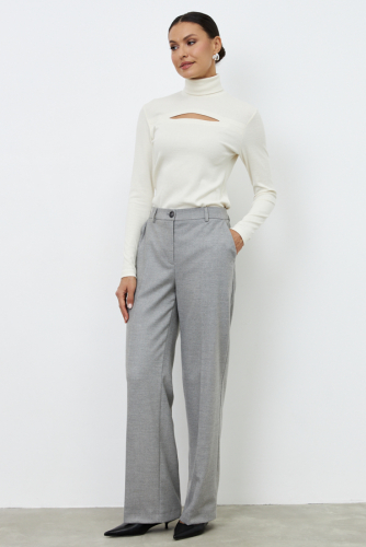 Брюки из костюмной ткани прямого силуэта. На передней половинке изделия выполнены карманы с подкройным бочком, на задней - талиевые вытачки и имитация карманов в рамку. Притачной пояс со шлёвками. Застёжка на молнию-гульфик и пуговицу. Такой крой выгодно подчеркнёт длину ваших ног.