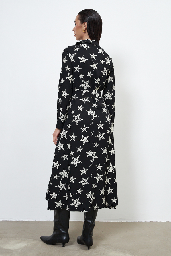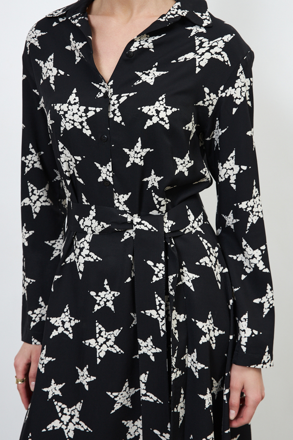Платье полуприлегающее в области груди и свободное в области бедер из вискозной ткани. Изделие отрезное по линии талии. Лиф с застёжкой на пуговицы. Вырез горловины обработан отложным воротником на стойке. Втачной длинный рукав. В комплекте пояс из основной ткани.