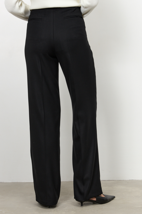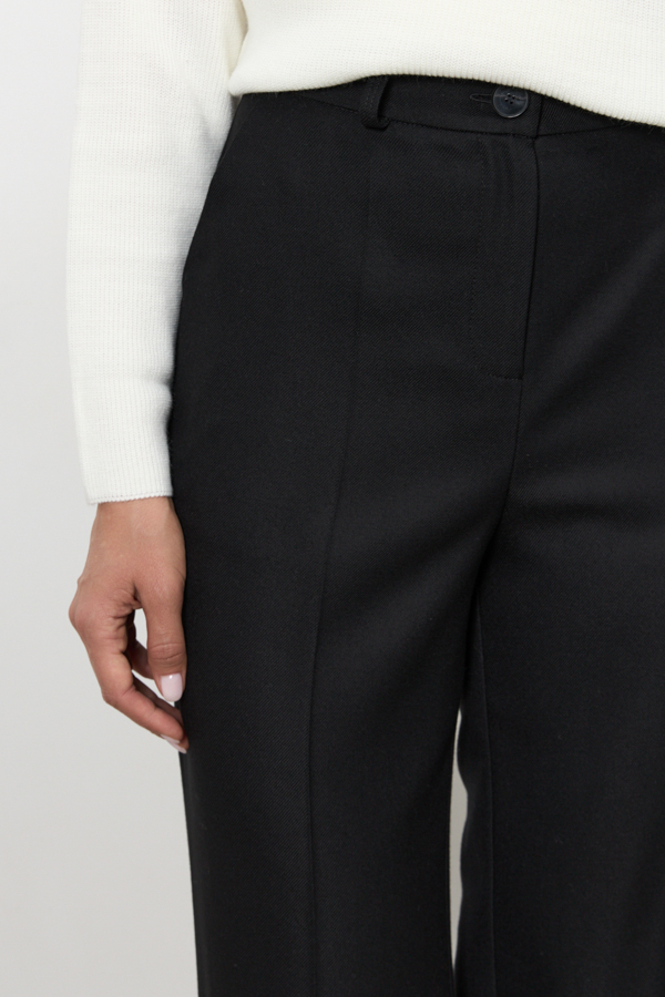 Брюки из костюмной ткани прямого силуэта. На передней половинке изделия выполнены карманы с подкройным бочком, на задней - талиевые вытачки и имитация карманов в рамку. Притачной пояс со шлёвками. Застёжка на молнию-гульфик и пуговицу. Такой крой выгодно подчеркнёт длину ваших ног.