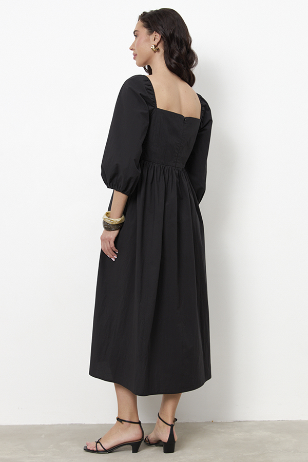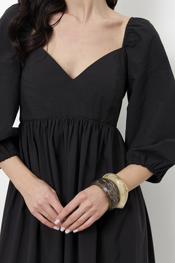Платье свободного силуэта из хлопковой ткани. Изделие отрезное по линии талии. Линия талия завышена и фигурная. Верхняя часть юбки со сборкой. По среднему шву спинки потайная молния. Лиф переда и спинки двухслойный, имеет рельефные швы. Окат рукава и низ рукава зафиксированы резиной.