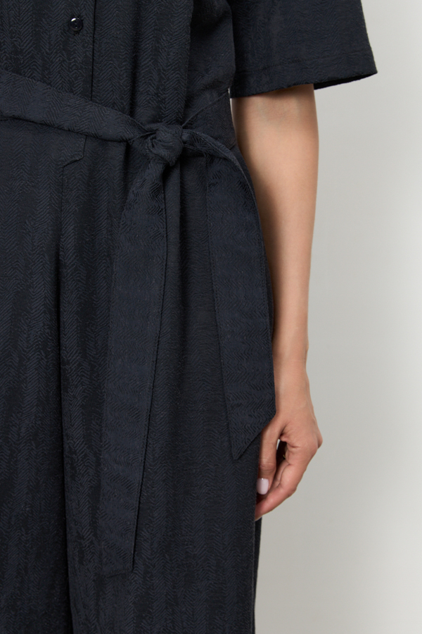 Стильный комбинезон из комфортной ткани. Свободный силуэт с застёжкой на пуговицы, в боковых швах карманы. Втачной короткий рукав. Вырез горловины обработан отложным воротником на стойке. Изделие с заниженной линией сидения обеспечивает комфортное движение. В комплекте пояс из основной ткани.