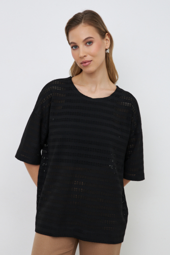 Костюм из эластичного полотна. Джемпер свободного силуэта со спущенной линией плеча и рукавом до локтя. Вырез горловины оформлен бейкой из основной ткани. Брюки прямого силуэта. Пояс с эластичной резиной. На передней части брюк застрочены стрелки.