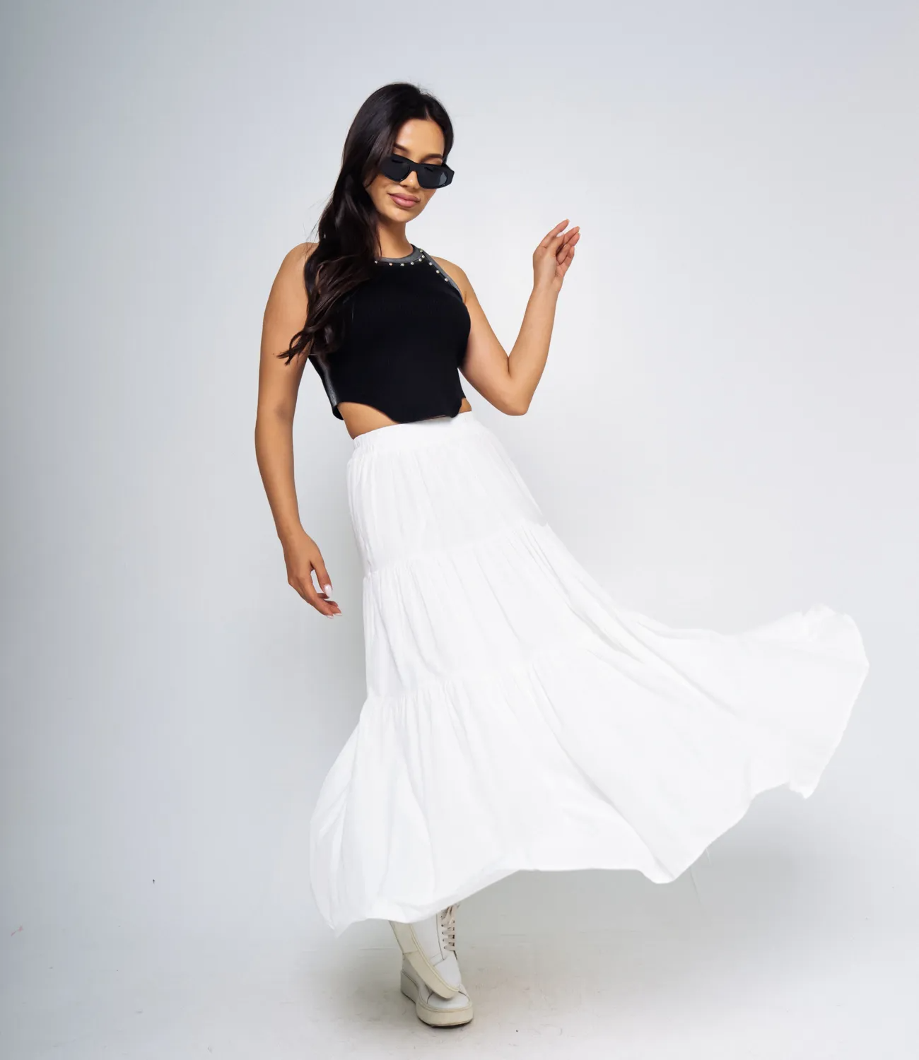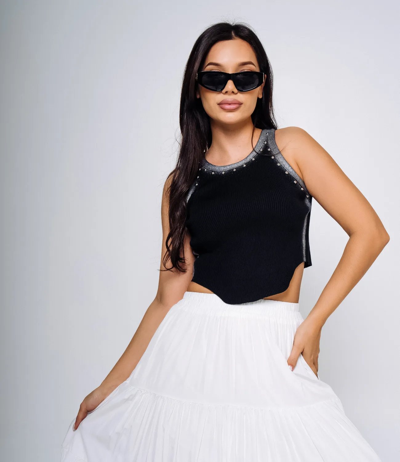 Топ – это одежда, которая подчеркивает женственность каждой девушки. Данная модель с металлическими заклепками по краю отлично подойдет для летнего сезона. Ее приобретают гостьи, которые ценят сочетание качества и цены. Силуэт подчеркивает привлекательность фигуры. Производитель умеет находить неординарные и модные решения. Для пошива использована ткань из 65% хлопка, 30% полиэстра, 5% эластана, которая характеризуется отличным качеством. Даже после многократных стирок изделие не утратит первоначальной индивидуальности. Вы сможете носить его с большим удовольствием. Обращайте внимание на цвет. Он является насыщенным и полностью соответствует фото на сайте. Чтобы вы не сомневались в размере, мы предоставили на странице таблицу. Воспользовавшись ею, вы сами сможете сделать мерки и убедиться. Установленная нами цена является доступной. Подарите себе удовольствие быть неповторимой! Рост 170см, 86-68-95.