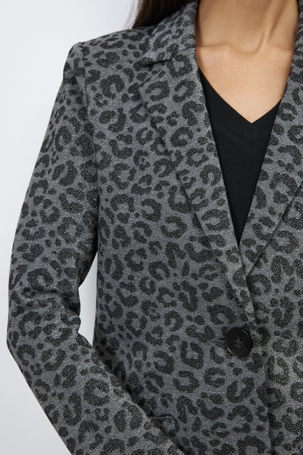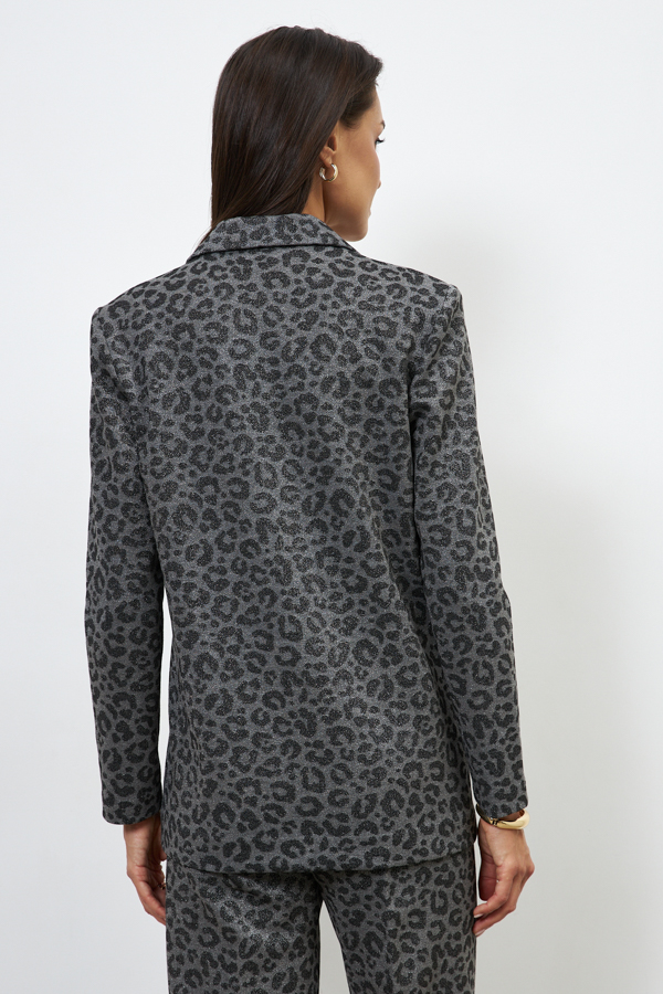 Костюм выполнен из эластичного полотна. Брюки прямого силуэта. На передней части брюк застрочены стрелки. Пояс с эластичной резиной. Жакет прямого силуэта с английским воротником и накладными карманами. На передней части жакета застежка на пуговицу. Втачной длинный рукав. Изделие с плечевыми накладками, которые при желании можно убрать.