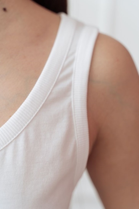 "Топ на широких бретелях. Вырез горловины круглый. Конструкция протестирована на женщинах с разным типом фигур.