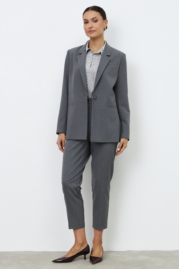 Жакет из костюмной ткани. Прямой силуэт с разрезами в боковых швах. Изделие с английским воротником и застежкой на пуговицу. На передней части жакета выполнен нагрудный карман с листочкой и карманы в рамку. Втачной длинный рукав, снизу шлица с пуговицами. Изделие идеально держит форму, имеет четкую линию плеча благодаря плечевым накладкам. Жакет на подкладке.