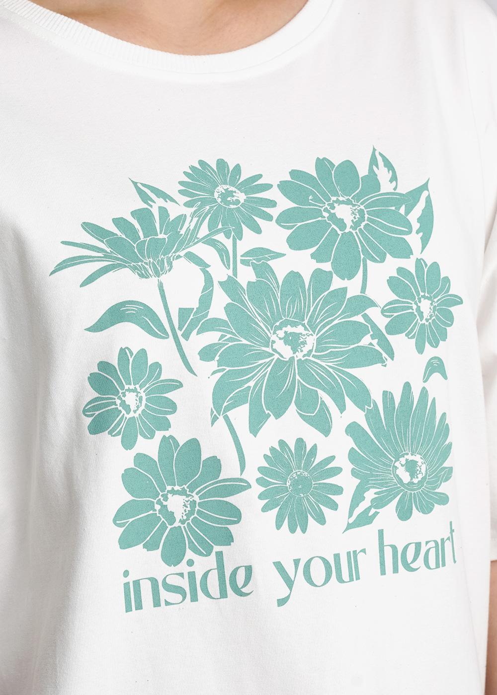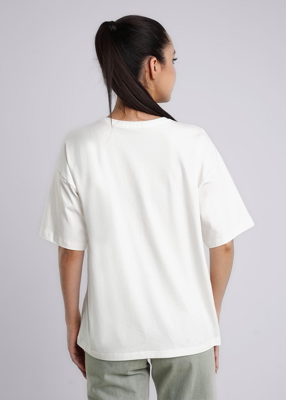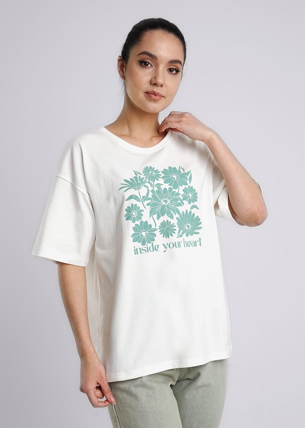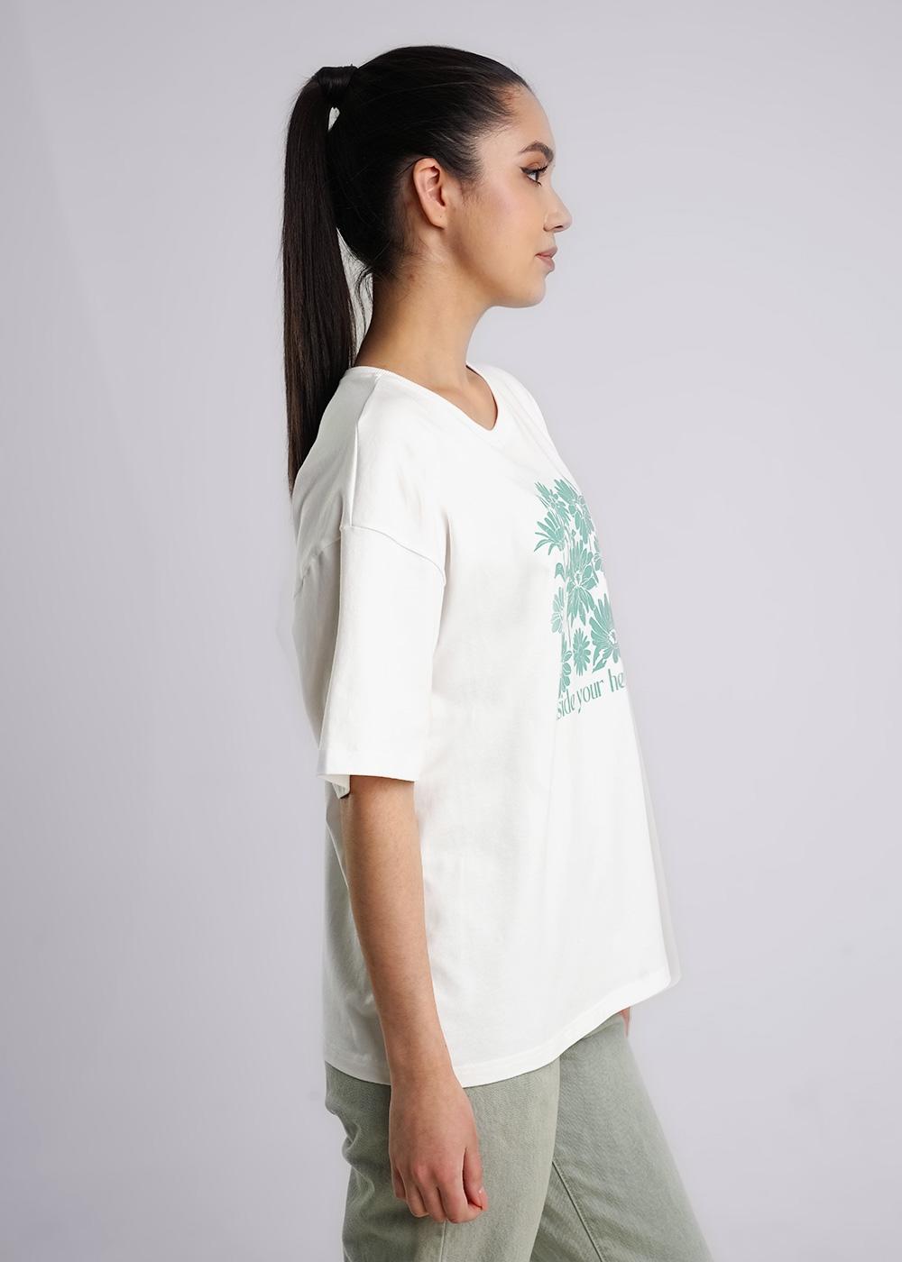 Джемпер оверсайз из эластичного трикотажного полотна. Короткий спущенный рукав. Круглый вырез горловины обработан кашкорсе. По переду принт.