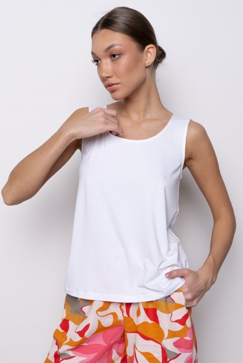 Майка свободного прилегания из вискозы –незаменимая деталь летнего гардероба. Вырез горловины круглый. Модель дополнит образ к любому поясному изделию, пиджаку,кардигану.