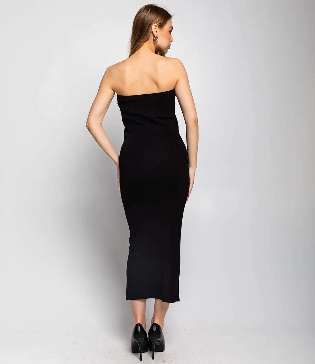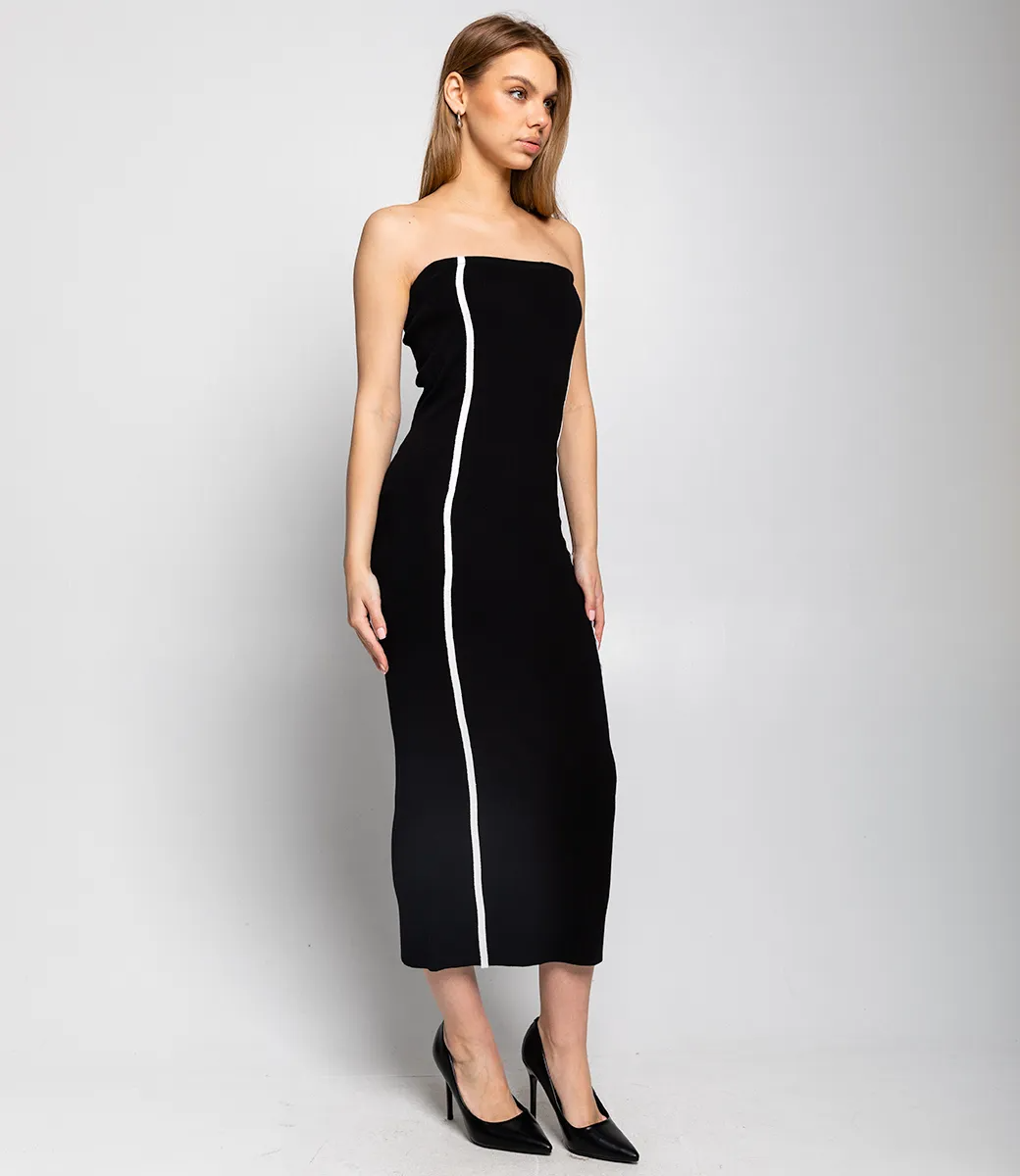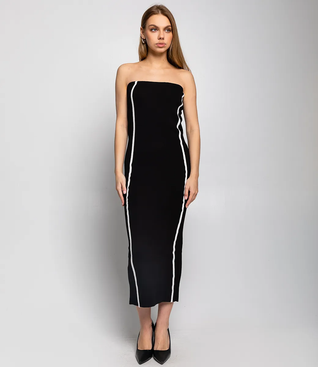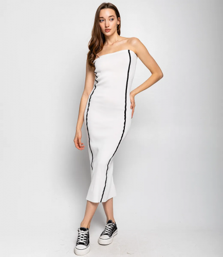 Это платье — прекрасный выбор для вашего магазина, предлагая стильный и универсальный дизайн, который станет отличным дополнением к гардеробу ваших клиентов. Платье имеет облегающий силуэт и длину миди, что создает элегантный и современный образ. Строгие линии делают его одновременно простым и эффектным. Без бретелек, что подчеркивает плечи и декольте. Платье декорировано вертикальными белыми линиями по бокам, которые делают более интересным. Эти линии придают изделию графичный и стильный вид. Изготовлено из ткани 65% хлопок, 35% полиэстер и 5% эластан, платье обеспечивает отличное качество и приятные тактильные ощущения. Независимо от сезона, она станет любимым элементом в гардеробе ваших клиентов. На странице сайта доступна таблица размеров, что позволит вашим покупателям легко найти подходящий вариант. Установленная цена делает это платье доступным для широкой аудитории, что обеспечит вам высокий уровень продаж. Рост модели 168, 89-63-90.