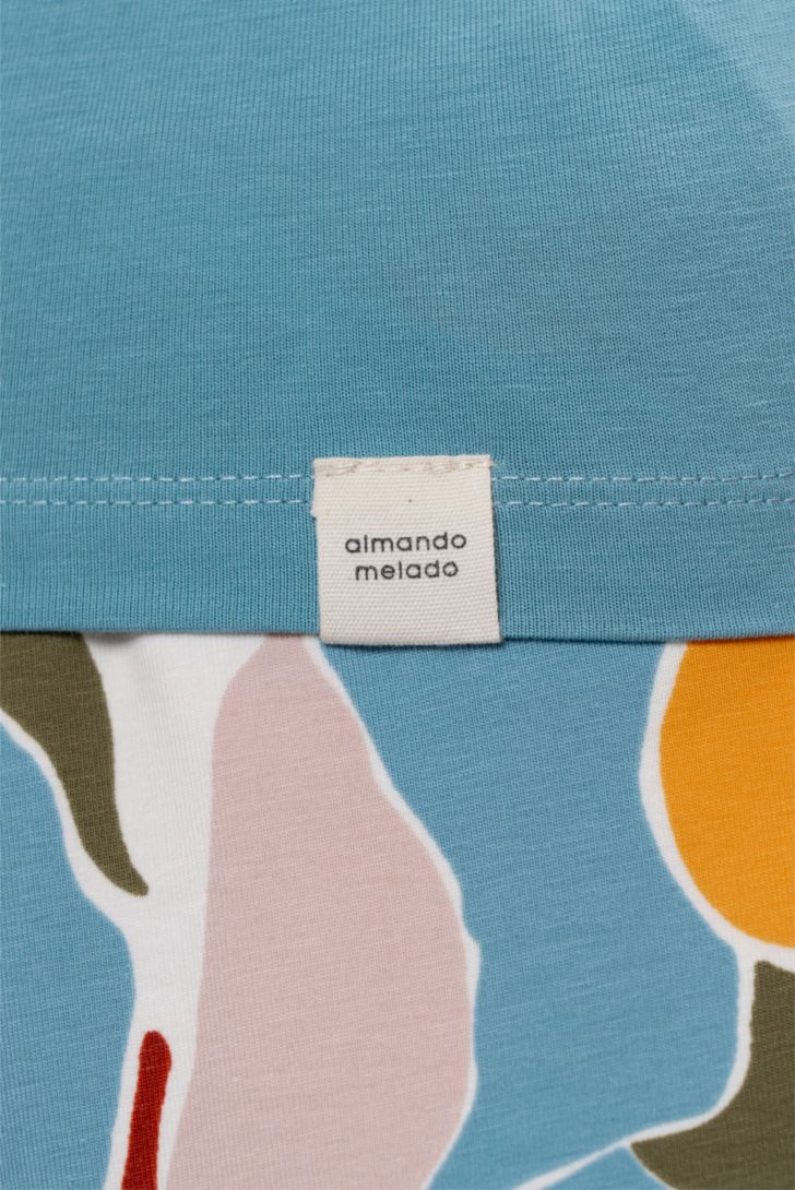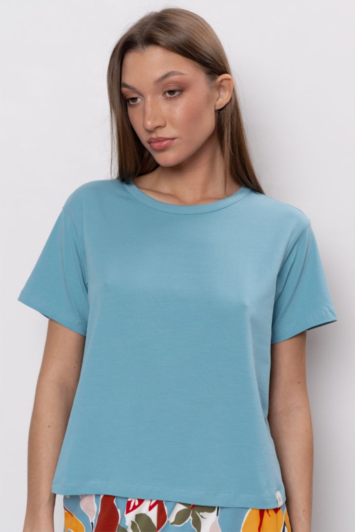 "Укороченная футболка с круглым вырезом горловины. Обработка горловины - обтачкой из рибаны. Линия плеча слегка приспущена.