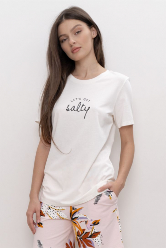 "Футболка свободного силуэта с коротким рукавом. Вырез горловины круглый, обработан рибаной.