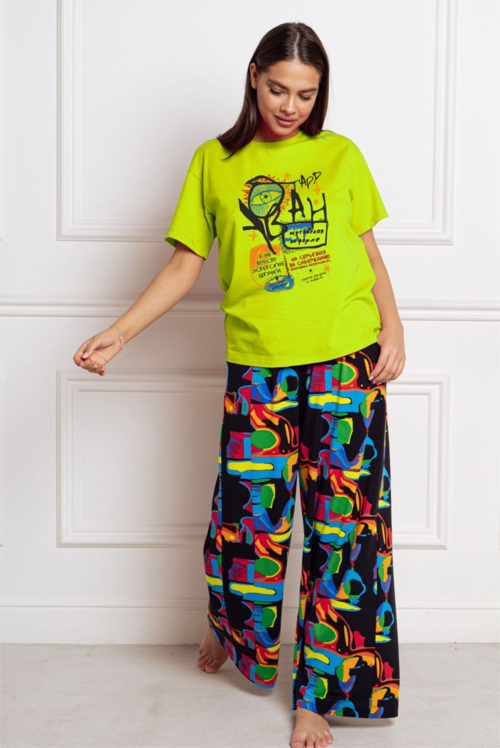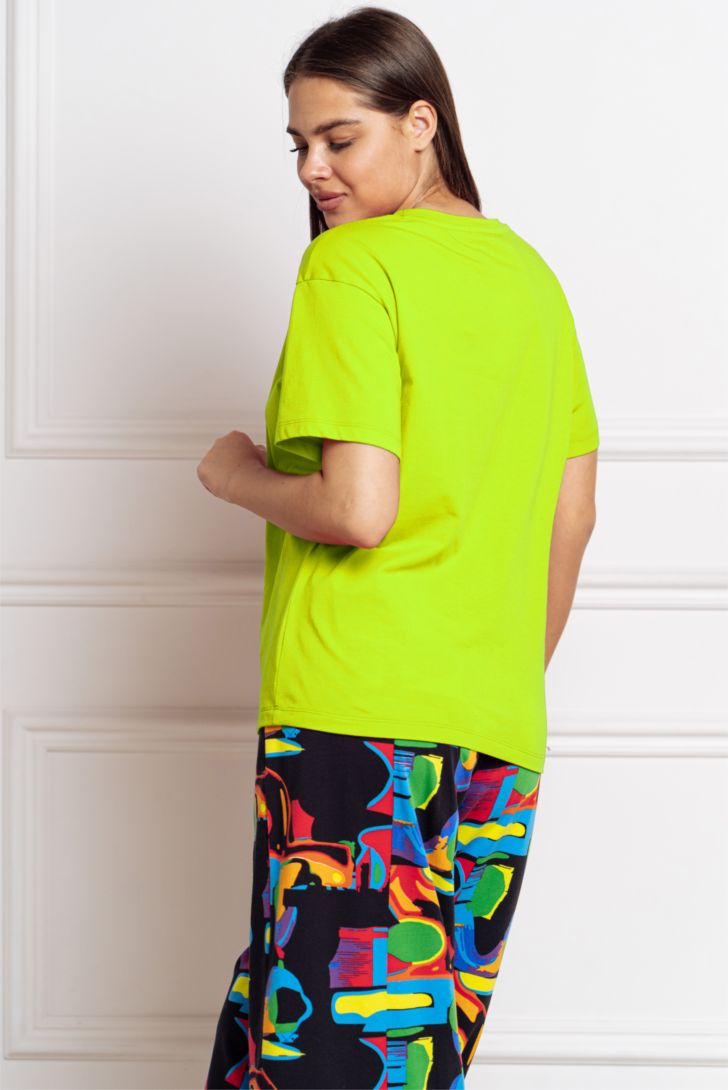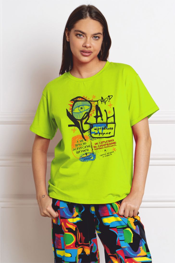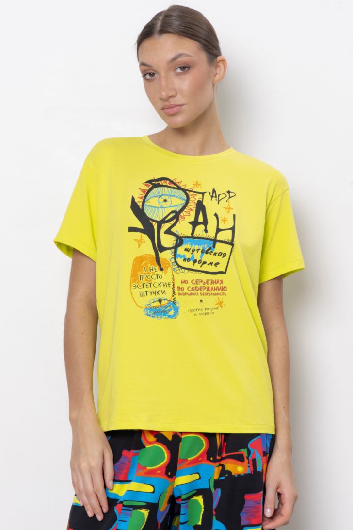 Футболка с круглым вырезом горловины. Линия плеча слегка приспущена. В сочетании с широкими брюками визуально увеличивает длину ног, делая образ утонченным и романтичным. Модель представлена в четырех цветовых решениях, декорирована авторским принтом.