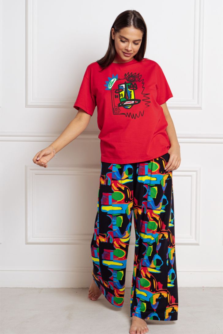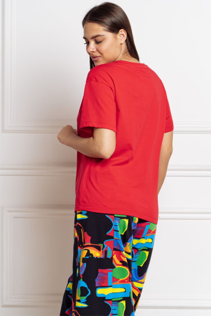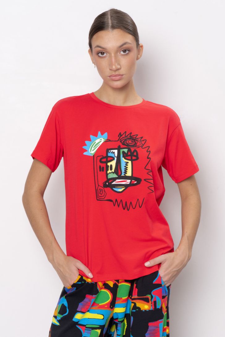Футболка с круглым вырезом горловины. Линия плеча слегка приспущена. В сочетании с широкими брюками визуально увеличивает длину ног, делая образ утонченным и романтичным. Модель представлена в четырех цветовых решениях, декорирована авторским принтом.