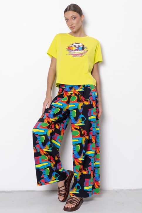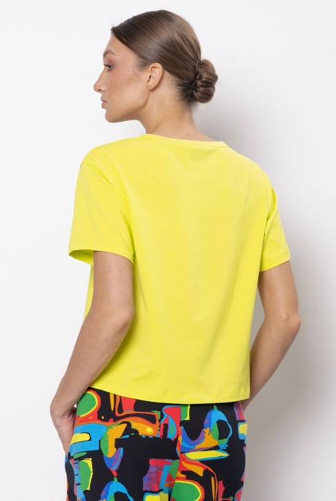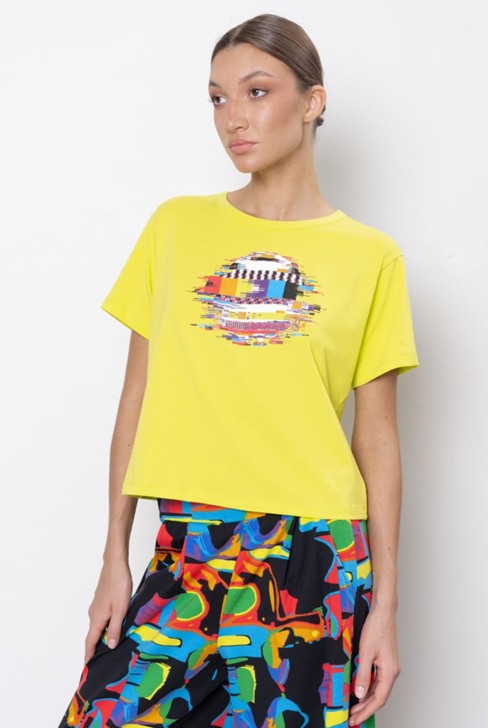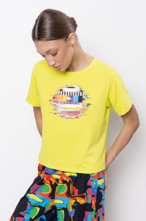 "Футболка укороченная с коротким рукавом и спущенной линией плеча. Вырез горловины круглый. Модель декорирована тематическим принтом.
